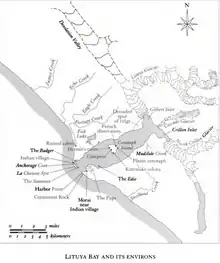 L'exploration de la baie se termine par une catastrophe, deux chaloupes sont emportées par le courant et 21 marins périssent dans la passe. Un monument est dressé en leur mémoire sur l'île située au centre de la baie, qui est baptisée « île du Cénotaphe »[1].