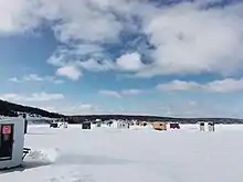 La baie de Gaspé en hiver avec ses cabanes de pêcheurs