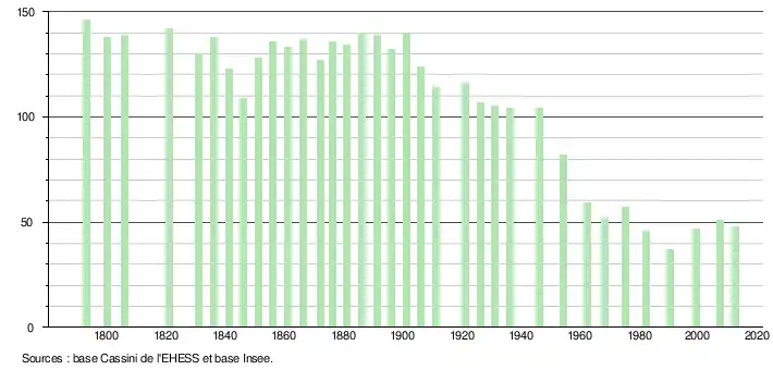 L'évolution du nombre d'habitants est connue à travers les recensements de la population effectués dans la commune depuis 1793. À partir du , les populations légales des communes sont publiées annuellement dans le cadre d'un recensement qui repose désormais sur une collecte d'information annuelle, concernant successivement tous les territoires communaux au cours d'une période de cinq ans. Pour les communes de moins de 10 000 habitants, une enquête de recensement portant sur toute la population est réalisée tous les cinq ans, les populations légales des années intermédiaires étant quant à elles estimées par interpolation ou extrapolation[2]. Pour la commune, le premier recensement exhaustif entrant dans le cadre du nouveau dispositif a été réalisé en 2007[3],[Note 1].