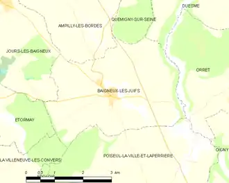 Le nom du bourg est attesté sous les formes Bagnos en 1201 puis Baigneux les Juifs dès 1391.