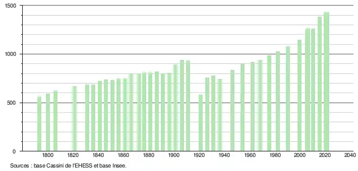 L'évolution du nombre d'habitants est connue à travers les recensements de la population effectués dans la commune depuis 1793. Pour les communes de moins de 10 000 habitants, une enquête de recensement portant sur toute la population est réalisée tous les cinq ans, les populations légales des années intermédiaires étant quant à elles estimées par interpolation ou extrapolation[35]. Pour la commune, le premier recensement exhaustif entrant dans le cadre du nouveau dispositif a été réalisé en 2005[36].