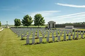 C'est donc à cette période que fut créé ce cimetière pour inhumer les soldats victimes des combats. Il fut utilisé jusqu'à la fin de la guerre. Après l'armistice de nombreux corps provenant de cimetières provisoires des environs y furent regroupés. C'est pour cette raison que sur les 1 293 soldats inhumés dans ce lieu, 752, soit plus de la moitié, ne sont pas identiflés[1],[2].