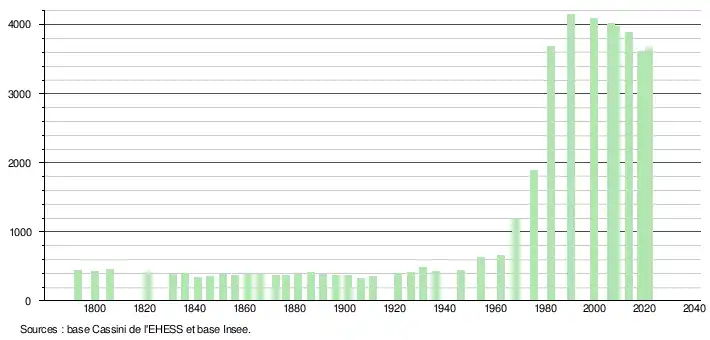 L'évolution du nombre d'habitants est connue à travers les recensements de la population effectués dans la commune depuis 1793. Pour les communes de moins de 10 000 habitants, une enquête de recensement portant sur toute la population est réalisée tous les cinq ans, les populations légales des années intermédiaires étant quant à elles estimées par interpolation ou extrapolation[22]. Pour la commune, le premier recensement exhaustif entrant dans le cadre du nouveau dispositif a été réalisé en 2008[23].