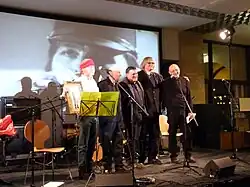 Balázs Györe (premier à droite) avec des membres du groupe littéraire d'avant-garde Fölöspéldány, fondé au printemps 1979. Photo prise à bibliothèque nationale Széchényi en 2016