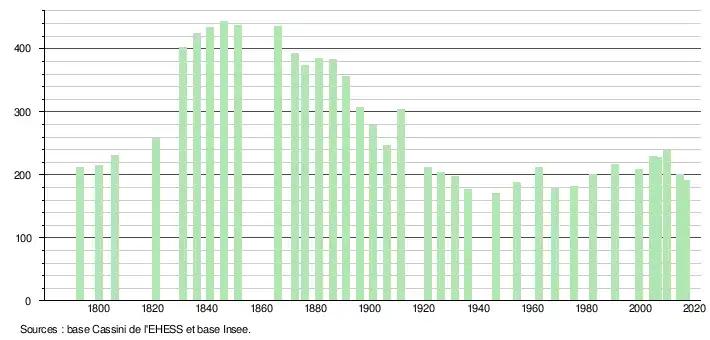 L'évolution du nombre d'habitants est connue à travers les recensements de la population effectués dans la commune depuis 1793. Pour les communes de moins de 10 000 habitants, une enquête de recensement portant sur toute la population est réalisée tous les cinq ans, les populations légales des années intermédiaires étant quant à elles estimées par interpolation ou extrapolation[7]. Pour la commune, le premier recensement exhaustif entrant dans le cadre du nouveau dispositif a été réalisé en 2004[8].