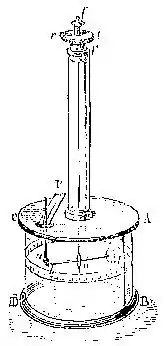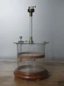 La balance de Coulomb est un large cylindre de verre avec des graduations angulaires, surmonté par un cylindre de diamètre plus petit qui supporte un fil de torsion. Ce fil, vertical, soutient un axe horizontal terminé par une petite sphère chargée. À la cage de verre est fixée à la même altitude une autre sphère chargée.