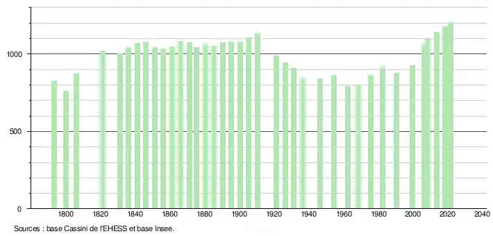 L'évolution du nombre d'habitants est connue à travers les recensements de la population effectués dans la commune depuis 1793. Pour les communes de moins de 10 000 habitants, une enquête de recensement portant sur toute la population est réalisée tous les cinq ans, les populations légales des années intermédiaires étant quant à elles estimées par interpolation ou extrapolation[24]. Pour la commune, le premier recensement exhaustif entrant dans le cadre du nouveau dispositif a été réalisé en 2008[25].