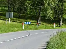 Une balise J1 est implantée sensiblement dans le prolongement de l'axe des voies que peut suivre un conducteur abordant la courbe.