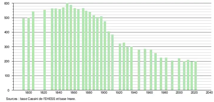 L'évolution du nombre d'habitants est connue à travers les recensements de la population effectués dans la commune depuis 1793. Pour les communes de moins de 10 000 habitants, une enquête de recensement portant sur toute la population est réalisée tous les cinq ans, les populations légales des années intermédiaires étant quant à elles estimées par interpolation ou extrapolation[20]. Pour la commune, le premier recensement exhaustif entrant dans le cadre du nouveau dispositif a été réalisé en 2006[21].