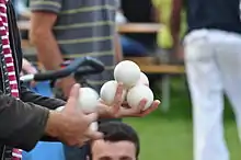 La jonglerie aux balles regroupe celle des ballons (plus gros) et des sacs à grains, ce qui montre que la forme de l’objet n’est pas toujours forcément parfaitement sphérique.