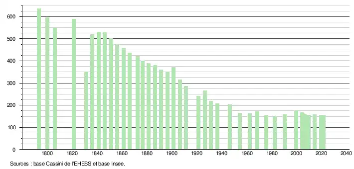 L'évolution du nombre d'habitants est connue à travers les recensements de la population effectués dans la commune depuis 1793. Pour les communes de moins de 10 000 habitants, une enquête de recensement portant sur toute la population est réalisée tous les cinq ans, les populations légales des années intermédiaires étant quant à elles estimées par interpolation ou extrapolation[18]. Pour la commune, le premier recensement exhaustif entrant dans le cadre du nouveau dispositif a été réalisé en 2004[19].