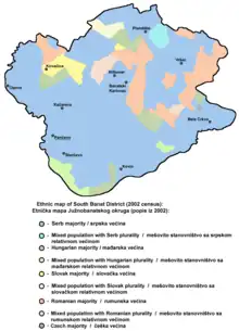Toutes les municipalités du district possèdent une majorité de Serbes, à l’exception de la municipalité de Kovačica qui est mêlée, avec une majorité relative de Slovaques (41 %).