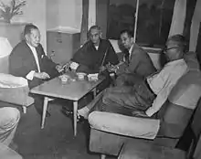 - Il est acquitté en 1951 selon l'Encyclopedia Nipponica et en 1952, la même année que son accession à la présidence de la Chambre des représentants, selon l'Encyclopædia Britannica[7].