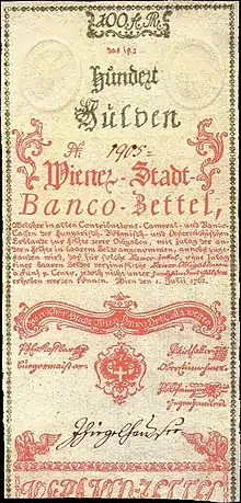 Le Bancozettel fut lancé en Autriche le et garanti par la Banque de la ville de Vienne (Wiener Stadtbanco), et est né peu après le contexte difficile de la guerre de Sept Ans alors que l’État autrichien était au bord de la faillite, avec une dette publique évaluée à 13 millions de florins. L’impératrice Marie-Thérèse donna son aval à ce nouvel instrument de crédit en 1761. La Banque de Vienne lança une émission à hauteur de 12 millions. La plupart des institutions d'alors les acceptèrent comme moyens de paiement. Le motif du billet est à l'origine une gravure sur métal ; l'estampe est imprimée sur un papier spécial, suivant deux passages de couleurs (noir et rouge) et comprend deux timbres à sec dans sa partie supérieure. Les billets de montants élevés sont imprimés principalement à l'encre rouge pour éviter la contrefaçon. Chaque coupon est signé et numéroté à la main.