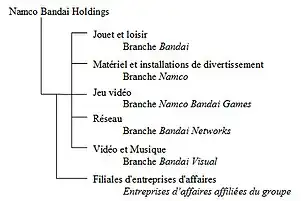 Bandai Namco Holdings est un groupe tentaculaire et à forte vocation expansive depuis sa création. Elle est organisée en cinq branches d'affaires stratégiques, complétées par les entreprises d'affaires affiliées qui fournissent un soutien logistique[13]. Ces branches sont composées des « Jouets et loisirs », des « Divertissements en réseau » (jeux vidéo), des « Divertissements réels » (arcades, VR, parcs de loisirs), de « Production visuelle et musicale » (production et distribution d'anime, de drama et de musique), de « Création de propriétés intellectuelles » (production d'anime).