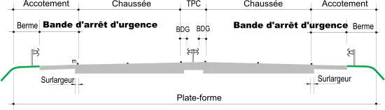 La largeur de la bande d'arrêt d'urgence est de 2,50 m, ou de 3,00 m lorsque le trafic poids lourd excède 2 000 v/j (deux sens confondus)[8].