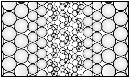 La microstructure subit alors de nombreux changements sous l'action de l'énergie libérée par la déformation. Lorsque le matériau est un métal, la taille moyenne des grains (ou cristallites) diminue jusqu'à atteindre une taille d'environ 100 nm au cœur de la bande (voir Fig. 1). Par ailleurs, des études récentes ont permis de révéler que certaines parties de la bande de cisaillement ne présentait plus une microstructure composée de grains. Ces zones ont alors les mêmes caractéristiques physiques que l'eau ou le verre. Il s'agit d'une structure amorphe comme le verre, les élastomères et les liquides.