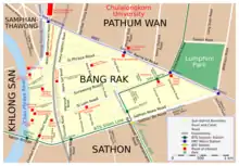- Hôtel de luxe Mandarin Oriental, Bibliothèque Neilson Hays Library[3],[4], Musée du Bangkokois[5],[6] (Bangkokian museum), Musée de Patpong[7] (Patpong Museum), Cathédrale de l'Assomption de Bangkok, Wat Hua Lamphong, Wat Maha Phruetharam Worawihan, etc.