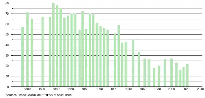 L'évolution du nombre d'habitants est connue à travers les recensements de la population effectués dans la commune depuis 1793. Pour les communes de moins de 10 000 habitants, une enquête de recensement portant sur toute la population est réalisée tous les cinq ans, les populations légales des années intermédiaires étant quant à elles estimées par interpolation ou extrapolation[16]. Pour la commune, le premier recensement exhaustif entrant dans le cadre du nouveau dispositif a été réalisé en 2006[17].