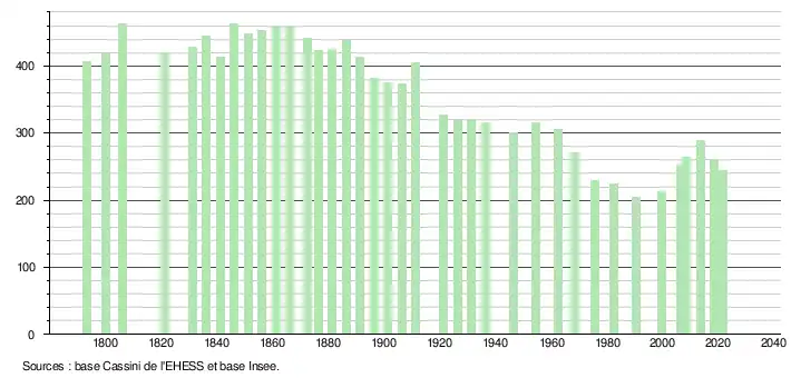 L'évolution du nombre d'habitants est connue à travers les recensements de la population effectués dans la commune depuis 1793. Pour les communes de moins de 10 000 habitants, une enquête de recensement portant sur toute la population est réalisée tous les cinq ans, les populations légales des années intermédiaires étant quant à elles estimées par interpolation ou extrapolation[27]. Pour la commune, le premier recensement exhaustif entrant dans le cadre du nouveau dispositif a été réalisé en 2008[28].