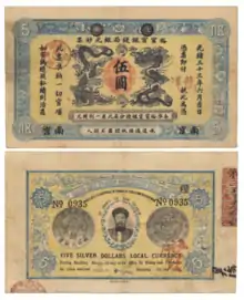 Malgré diverses tentatives, les gouvernements impérial et républicain chinois n'avaient pas de banque centrale qui réglementait les systèmes monétaires chinois à l'époque, mais devaient faire face à de grands réseaux de banques privées répartis dans toute la Chine, qui avaient plus d'influence sur le système monétaire chinois. À cette époque, le cuivre était très couramment utilisé pour la monnaie, mais l'argent était le principal moyen d'échange et toute l'économie de la Chine reposait de facto sur le silver standard[22].