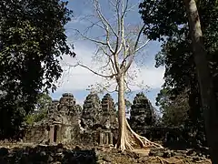 Envahi par la végétation, le temple, malgré les travaux de dégagement, est encore occupé par de gigantesques fromagers dont les racines minent l'édifice à plusieurs endroits.