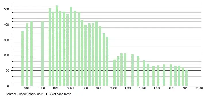 L'évolution du nombre d'habitants est connue à travers les recensements de la population effectués dans la commune depuis 1793. Pour les communes de moins de 10 000 habitants, une enquête de recensement portant sur toute la population est réalisée tous les cinq ans, les populations légales des années intermédiaires étant quant à elles estimées par interpolation ou extrapolation[16]. Pour la commune, le premier recensement exhaustif entrant dans le cadre du nouveau dispositif a été réalisé en 2006[17].
