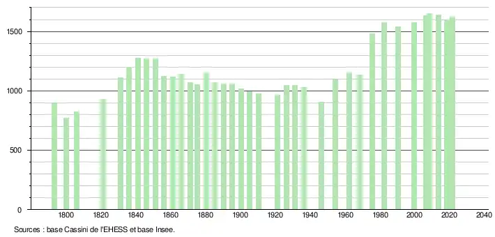 L'évolution du nombre d'habitants est connue à travers les recensements de la population effectués dans la commune depuis 1793. Pour les communes de moins de 10 000 habitants, une enquête de recensement portant sur toute la population est réalisée tous les cinq ans, les populations légales des années intermédiaires étant quant à elles estimées par interpolation ou extrapolation[16]. Pour la commune, le premier recensement exhaustif entrant dans le cadre du nouveau dispositif a été réalisé en 2008[17].
