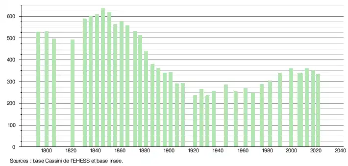 L'évolution du nombre d'habitants est connue à travers les recensements de la population effectués dans la commune depuis 1793. Pour les communes de moins de 10 000 habitants, une enquête de recensement portant sur toute la population est réalisée tous les cinq ans, les populations légales des années intermédiaires étant quant à elles estimées par interpolation ou extrapolation[23]. Pour la commune, le premier recensement exhaustif entrant dans le cadre du nouveau dispositif a été réalisé en 2007[24].