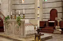 Sur un des flancs des fonts baptismaux, s’élève un autel décoré de panneaux sculptés et incrustés, entouré d’un parapet sculpté par Guglielmo (it) au XIIe siècle. L’ensemble provient de la cathédrale, il a probablement été déplacé au baptistère entre le XVe et le XVIe siècle[3].