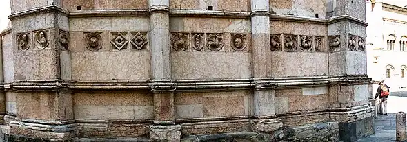 De même, les éléments séparés des mois de l’année placés juste en-dessous du plancher de la première galerie interne et qui représentent les signes du zodiaque, semblent avoir été disposés là ultérieurement[9]. À l’extérieur, c’est également le cas pour les sculptures des deux prophètes David et Nathan, les deux archanges Gabriel et Michel, Salomon et la reine de Saba. Elles se trouvent toutes avoir été réadaptées et placées durant la campagne campionese de 1260-1270 dans les niches où on les voit aujourd’hui, autour du portail septentrional[10].