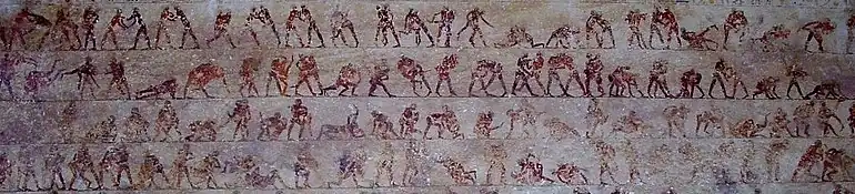 Le mur oriental montre une forteresse garnie d'Égyptiens et assiégée par une armée mixte composée d'infanterie égyptienne, d'archers nubiens et peut-être de mercenaires libyens[3], représentant probablement une offensive thébaine ; sur le même mur sont également représentées un nombre impressionnant de positions et de techniques de lutte.