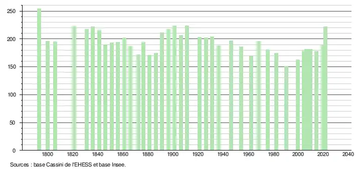 L'évolution du nombre d'habitants est connue à travers les recensements de la population effectués dans la commune depuis 1793. Pour les communes de moins de 10 000 habitants, une enquête de recensement portant sur toute la population est réalisée tous les cinq ans, les populations légales des années intermédiaires étant quant à elles estimées par interpolation ou extrapolation[27]. Pour la commune, le premier recensement exhaustif entrant dans le cadre du nouveau dispositif a été réalisé en 2004[28].