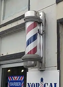Le poteau de barbier, avec ses rayures spirales bleues, rouges et blanches, symbolise différents aspects du métier. C'est un symbole de l'époque où les barbiers pratiquaient des procédures médicales. Les rayures blanches et rouges représentent les bandages et le sang, tandis que les rayures bleues représentent les veines. Le poteau peut être stationnaire ou rotatif, souvent à l'aide d'un moteur électrique[4],[5]. Un poteau de barbier en rotation crée une illusion d'optique, dans laquelle les rayures semblent monter ou descendre le long du poteau, plutôt que d'en faire le tour[6],[7].