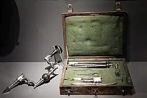 Cependant, à la fin du XVIIe siècles, à la suite de deux évènements, les chirurgiens et chirurgiens-barbiers obtiennent leur revanche. En 1686, c'est l'opération de la fistule anale de Louis XIV[27] par Charles-François Felix de Tassy[28]. Le succès de l'opération incite le souverain à accorder ses faveurs aux chirurgiens de Versailles qui sont dotés de statut royaux en 1719, et qui serviront de modèles dans toutes les provinces en 1730. La promotion sociale et scientifique des chirurgiens est confirmée par Louis XV qui patronne la Société académique des chirurgiens de Paris (1731), qui devient en 1748, l'Académie Royale de Chirurgie[25]. Celle-ci publie les Mémoires de l'Académie Royale de Chirurgie (1743-1773), une des premières publications scientifiques régulières.