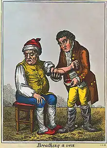 À Londres, cette séparation survient en 1745[38]. En Europe, les chirurgiens sont placés au même rang que les médecins, et ils sont considérés comme plus utiles qu'eux dans l'armée et la marine. En moins d'un siècle, les chirurgiens, anciens barbiers-chirurgiens, sont devenus les plus prestigieux et les plus demandés des praticiens de santé[39]. Artisan-boutiquier à la fin du Moyen Âge, le chirurgien est parvenu, à la fin du XVIIIe siècle, au rang du bourgeois en France, et du gentleman en Angleterre. Les rôles sont inversés, c'est désormais la chirurgie qui sert de modèle à la médecine[40].