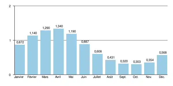 Les crues sont fort peu importantes, caractéristique partagée par les rivières voisines. Les QIX 2 et QIX 5 valent respectivement 1,6 et 2,5 m3/s. Le QIX 10 est de 3 m3/s, le QIX 20 de 3,5 m3/s, tandis que le QIX 50 se monte à seulement 4,2 m3/s.