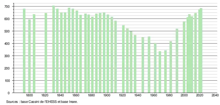 L'évolution du nombre d'habitants est connue à travers les recensements de la population effectués dans la commune depuis 1793. Pour les communes de moins de 10 000 habitants, une enquête de recensement portant sur toute la population est réalisée tous les cinq ans, les populations légales des années intermédiaires étant quant à elles estimées par interpolation ou extrapolation[17]. Pour la commune, le premier recensement exhaustif entrant dans le cadre du nouveau dispositif a été réalisé en 2004[18].