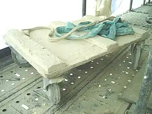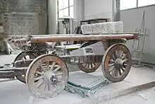 Une inscription à Éleusis[2] relate le transport en chariot à bœufs, vers -330, de tambours de colonnes depuis les carrières du Pentélique jusqu'au prostoon de Philon à Éleusis, dont chacun pesait environ 7,5 tonnes. Il se fit à flanc de montagne sur des traîneaux freinés par des câbles, et en plaine sur une distance de 35 km, sur une sorte de chariot de charpente robuste tiré par des bœufs.
