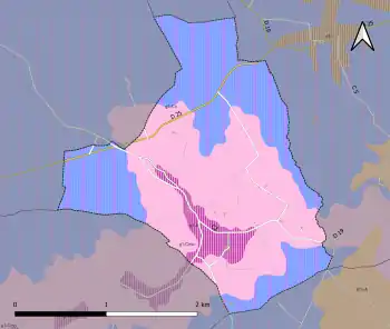 L'occupation des sols de la commune, telle qu'elle ressort de la base de données européenne d’occupation biophysique des sols Corine Land Cover (CLC), est marquée par l'importance des territoires agricoles (95,1 % en 2018), une proportion identique à celle de 1990 (95,1 %). La répartition détaillée en 2018 est la suivante : terres arables (71,1 %), zones agricoles hétérogènes (24 %), forêts (4,9 %)[35]. L'évolution de l’occupation des sols de la commune et de ses infrastructures peut être observée sur les différentes représentations cartographiques du territoire : la carte de Cassini (XVIIIe siècle), la carte d'état-major (1820-1866) et les cartes ou photos aériennes de l'IGN pour la période actuelle (1950 à aujourd'hui)[Carte 3].