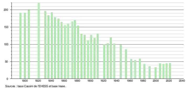 L'évolution du nombre d'habitants est connue à travers les recensements de la population effectués dans la commune depuis 1793. Pour les communes de moins de 10 000 habitants, une enquête de recensement portant sur toute la population est réalisée tous les cinq ans, les populations légales des années intermédiaires étant quant à elles estimées par interpolation ou extrapolation[54]. Pour la commune, le premier recensement exhaustif entrant dans le cadre du nouveau dispositif a été réalisé en 2006[55].