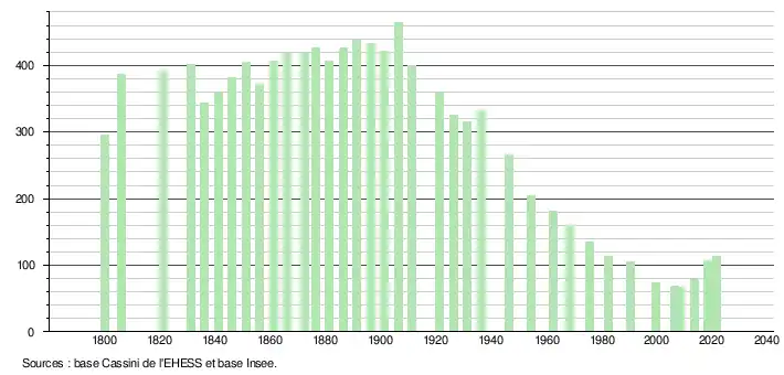 L'évolution du nombre d'habitants est connue à travers les recensements de la population effectués dans la commune depuis 1800. Pour les communes de moins de 10 000 habitants, une enquête de recensement portant sur toute la population est réalisée tous les cinq ans, les populations légales des années intermédiaires étant quant à elles estimées par interpolation ou extrapolation[25]. Pour la commune, le premier recensement exhaustif entrant dans le cadre du nouveau dispositif a été réalisé en 2008[26].