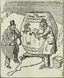 Le terme « baril de porc » provient à l'origine du stockage de la viande de porc salée dans un baril[8]. Dans les années 1870, les références au « porc » sont courantes au Congrès américain, et le terme est popularisé par un article de 1919 de Chester Collins Maxey dans la National Municipal Review. Il fait état de certains actes législatifs connus des membres du Congrès sous le nom de « projets de loi sur le baril de porc ». Il affirme que l'expression provient d'une pratique d'avant la guerre civile consistant à donner aux esclaves un baril de porc salé en récompense et à les obliger à se faire concurrence pour obtenir leur part de l'aumône[9]. Plus généralement, un baril de porc salé est un article de garde-manger courant dans les ménages du XIXe siècle et peut être utilisé comme une mesure du bien-être financier d'une famille. Par exemple, dans son roman de 1845 The Chainbearer, James Fenimore Cooper écrit : « Je tiens une famille pour désespérée, quand la mère peut voir le fond du baril de porc[10] ».
