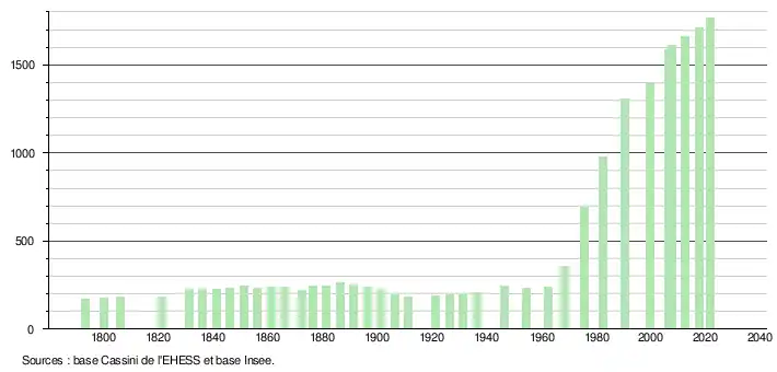 L'évolution du nombre d'habitants est connue à travers les recensements de la population effectués dans la commune depuis 1793. Pour les communes de moins de 10 000 habitants, une enquête de recensement portant sur toute la population est réalisée tous les cinq ans, les populations légales des années intermédiaires étant quant à elles estimées par interpolation ou extrapolation[23]. Pour la commune, le premier recensement exhaustif entrant dans le cadre du nouveau dispositif a été réalisé en 2007[24].