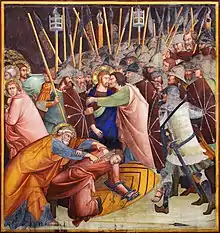 On retrouve le groupe des soldats avec lances vu chez Giotto, qui fait irruption dans le Jardin des oliviers (panneau adjacent à droite) et est utilisé dynamiquement, dans une tentative de synthèse entre la rigueur giottesque et la mouvance siennoise. La courbe descendante des casques chasse le groupe des Apôtres du « lieu figuratif ». La composition dynamique est résumée dans le mouvement contradictoire du soldat du premier plan vu de trois quarts arrière, et du groupe saint Pierre-Malchus. Un mouvement enveloppe Judas et le Christ, dont l'accolade est située exactement au-dessus de la rencontre des diagonales clairement suggérées. La narration est animée mais elle perd la force tragique de Giotto : le « gothique international » commence à se mettre au point, à partir d'une synthèse élégante des acquis du ‘‘Trecento[7].