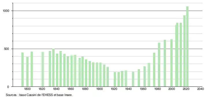 L'évolution du nombre d'habitants est connue à travers les recensements de la population effectués dans la commune depuis 1793. Pour les communes de moins de 10 000 habitants, une enquête de recensement portant sur toute la population est réalisée tous les cinq ans, les populations légales des années intermédiaires étant quant à elles estimées par interpolation ou extrapolation[27]. Pour la commune, le premier recensement exhaustif entrant dans le cadre du nouveau dispositif a été réalisé en 2007[28].
