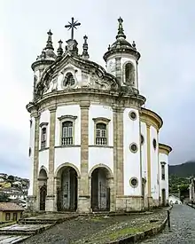 Toutefois, ces éléments n'ont été consommés que vers la fin du cycle. Au début du siècle, les églises tiraient encore leurs plans de l'architecture chã, avec une conception rectangulaire, une façade austère et un fronton triangulaire, un modèle illustré dans la cathédrale de Mariana (pt). Pedro Gomes Chaves a introduit en 1733 d'importantes innovations dans la basilique mineure de Notre-Dame-du-Pilar d'Ouro Preto (pt), avec une façade en plans disjoints et un plan rectangulaire, mais dont la sculpture a redéfini l'espace intérieur sous la forme d'un décagone[89]. Son frontispice sculpté dans la pierre ollaire du Sanctuaire de Bom Jesus de Matosinhos (1750) est considéré comme le premier exemple brésilien de cette solution décorative, peut-être l'œuvre de Jerônimo Félix Teixeira. Aujourd'hui inscrit au patrimoine mondial, le sanctuaire se distingue principalement par sa mise en œuvre scénographique et monumentale, abritant même le plus grand et le plus important groupe de sculptures d'Aleijadinho[90],[91],[92].