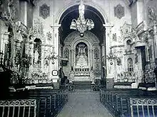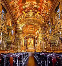 Dans la seconde moitié du XVIIIe siècle, l'influence française commence à prédominer, générant une dérivation rococo, plus légère et élégante, plus ouverte et raréfiée, dont la plus grande floraison se produit dans le Minas Gerais, caractérisée par des retables d'une grande composition sculpturale et des éléments ornementaux sous forme de coquilles, de cravates, de guirlandes et de fleurs, avec des fonds blancs et de l'or dans les parties en relief[56],[124]. Dans le nord-est également, le rococo a richement décoré de nombreuses églises, comme l'église matrice du Santíssimo Sacramento de Santo Antônio (pt), et à Rio, les églises du Tiers-Ordre du Carmen (pt), Santa Cruz dos Militares et Santa Rita de Cássia, notamment, sont remarquables. Dans un grand nombre de cas, dans tout le Brésil, une sculpture rococo a remplacé la plus ancienne sculpture baroque et, au cours des siècles suivants, il y a eu de fréquentes rénovations et réformes des décorations intérieures, de sorte qu'une partie importante de l'aspect primitif des églises baroques brésiliennes a déjà été défigurée[124],[125].