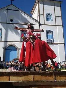 Outre la beauté des formes et la richesse des matériaux, au cours du baroque, le catholicisme a utilisé avec insistance l'aspect émotionnel du culte. L'amour, la dévotion et la compassion étaient visuellement stimulés par la représentation des moments les plus dramatiques de l'histoire sacrée, et ainsi abondaient les Christs flagellés, les cœurs immaculés de Marie, les crucifix ensanglantés, et les pathétiques icônes de procession (pt), véritables marionnettes articulées, avec de vrais cheveux, dents et vêtements, qui étaient portées dans des processions solennelles et féeriques où les larmes et les mortifications physiques ne manquaient pas, et les péchés étaient confessés à voix haute[44]. Les festivités religieuses étaient en effet plus qu'une forme d'expression pieuse, elles étaient aussi les moments les plus importants de la socialisation collective de la vie coloniale, se prolongeant souvent dans l'environnement privé[47]. L'intensité de ces événements a été enregistrée dans de nombreux récits de l'époque, comme celui du père Antônio Gonçalves, qui a participé à une procession de la Semaine sainte à Porto Seguro :