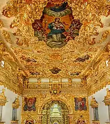 Ce cadre, qui avait un caractère scénographique et était équivalent, dans son concept et sa fonction, aux arcs de triomphe de l'Antiquité[20], créait une niche, remplie d'un piédestal pour la statue d'un saint. La base des retables était une boîte ou une table également décorée, qui pouvait être remplacée par des colonnes de soutien. Les principaux retables des chapelles principales pouvaient être très imposants. Cette forme spécifique a reçu le nom de « style national portugais », qui est devenu le modèle dominant de la décoration intérieure du milieu du XVIIe siècle jusqu'au début du XVIIIe siècle. Naturellement, il y a eu diverses interprétations du modèle, et les différents ordres religieux ont adopté leurs propres variations qui sont devenues typiques ; les jésuites avaient tendance à être plus sobres, tandis que les franciscains préféraient un luxe fastueux. Pendant toute l'époque du « style national », la sculpture était, en règle générale, peu projetée dans l'espace, suivant de près la conformation de l'architecture. Dans les plafonds, le style national s'est cristallisé dans la formule des « caissons », un travail de sculpture avec des zones polygonales vides, où des peintures ont été insérées. Les exemples notables de cette période sont la Chapelle dorée de Recife, l'une des premières de ce style, et l'église de Saint-François (pt), l'une des plus riches du Brésil ; sa luxuriante sculpture dorée couvre entièrement toutes les surfaces internes, avec un effet d'ensemble impactant[56],[62],[124].